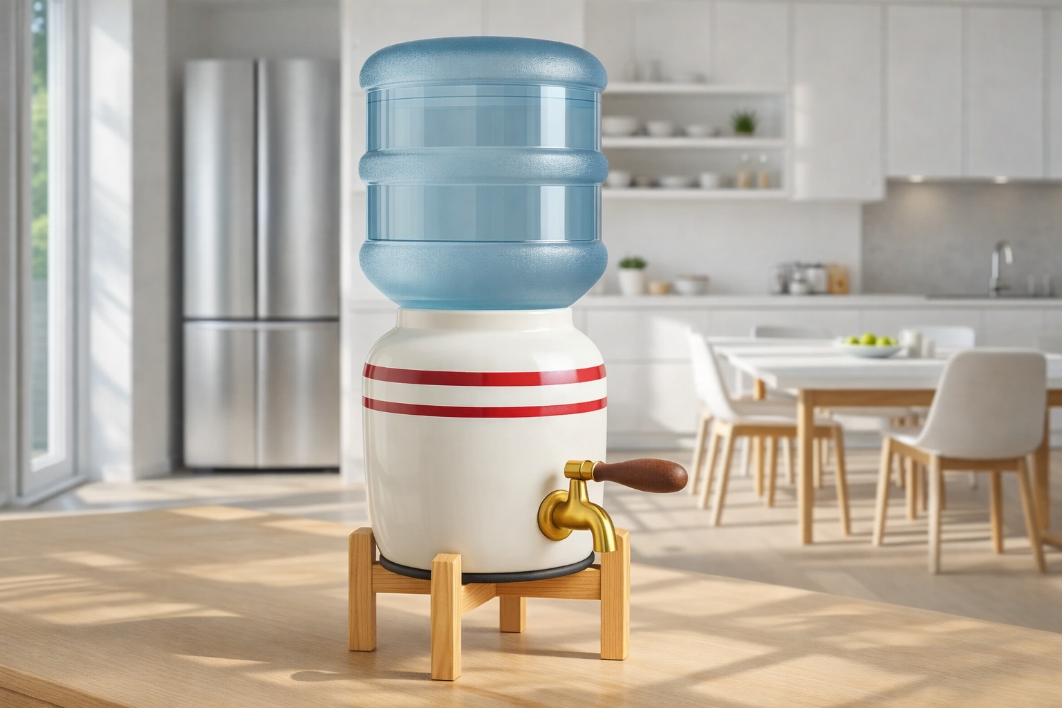 Bądźmy szczerzy: wielka, niebieska butla z wodą (18.9L) rzadko pasuje do wystroju nowoczesnej kuchni czy przytulnego salonu. Plastikowa pompka ręczna też nie dodaje jej uroku. Dystrybutor ceramiczny to zupełnie inna liga.