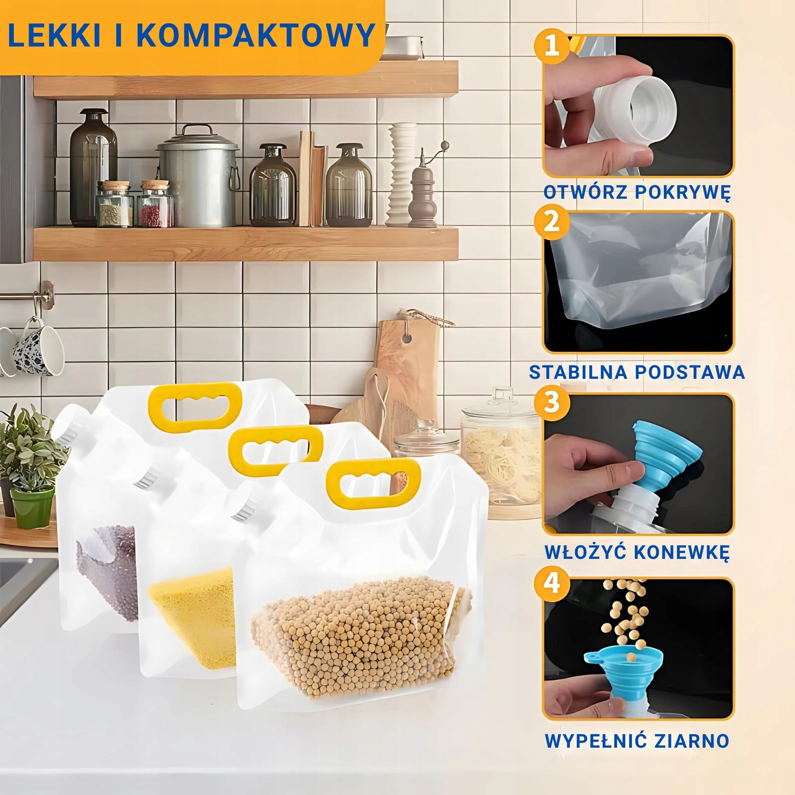 Pojemnik ma zintegrowany uchwyt, który ułatwia przenoszenie nawet w pełni napełnionego naczynia. Szeroki otwór o średnicy 2,2 cm umożliwia szybkie napełnianie lub opróżnianie bez zbędnego wysiłku. W zestawie znajduje się silikonowy składany lejek, który ułatwia przesypywanie zbóż lub nalewanie płynów.
