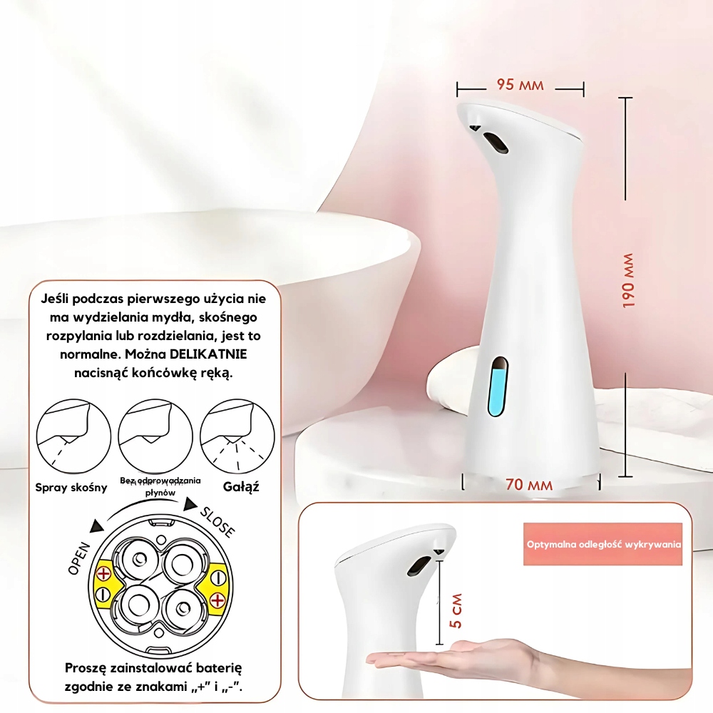 Urządzenie wyposażone jest w zbiornik o pojemności 200 ml, co pozwala na wygodne, codzienne użytkowanie bez konieczności częstego uzupełniania. Zasilanie na baterie AAA sprawia, że dozownik jest w pełni mobilny i można go ustawić w dowolnym miejscu, bez potrzeby podłączania do gniazdka. Minimalistyczny design doskonale komponuje się z każdym wnętrzem – od klasycznych po nowoczesne aranżacje.