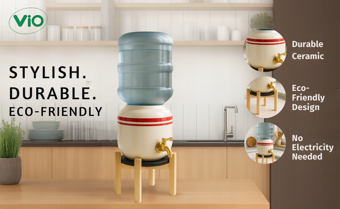 Ceramiczny dystrybutor ViO CD-02 w wersji biały z czerwonym paskiem wyróżnia się wyrazistym, eleganckim akcentem kolorystycznym. Wykonany z ceramiki spożywczej, zapewnia naturalny smak wody bez konieczności używania filtrów czy prądu.
