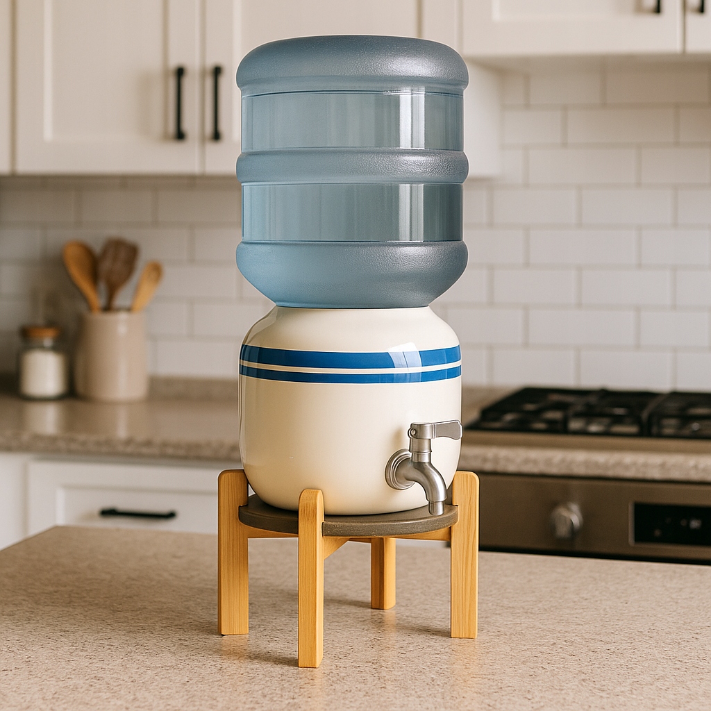Model obsługuje butle 11–19 litrów, dzięki czemu świetnie sprawdzi się zarówno w domu, jak i biurze lub recepcji. Gładka powierzchnia ceramiki ułatwia czyszczenie, a ponadczasowy design z subtelnym niebieskim pasem wprowadza do wnętrza delikatny akcent kolorystyczny.