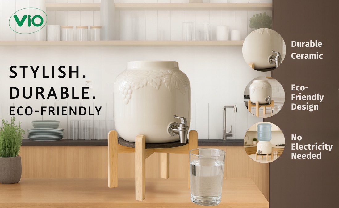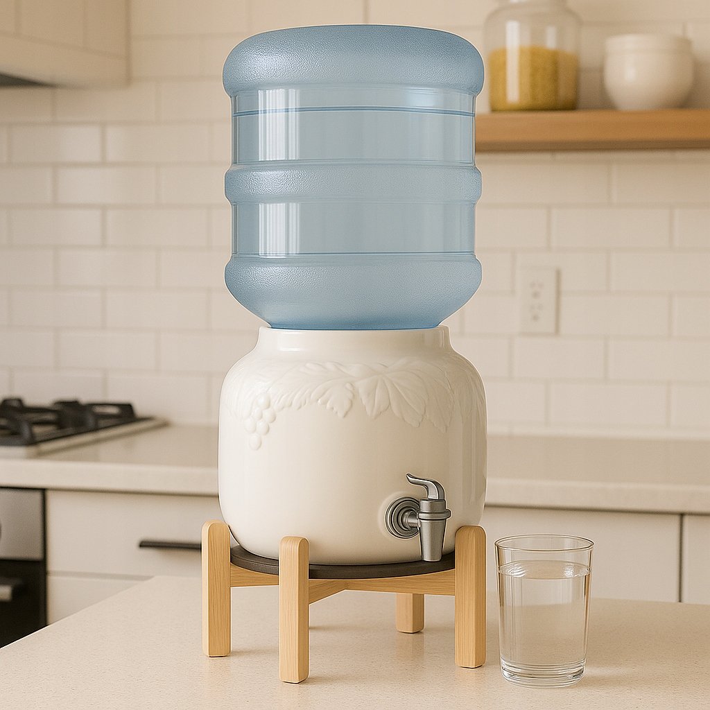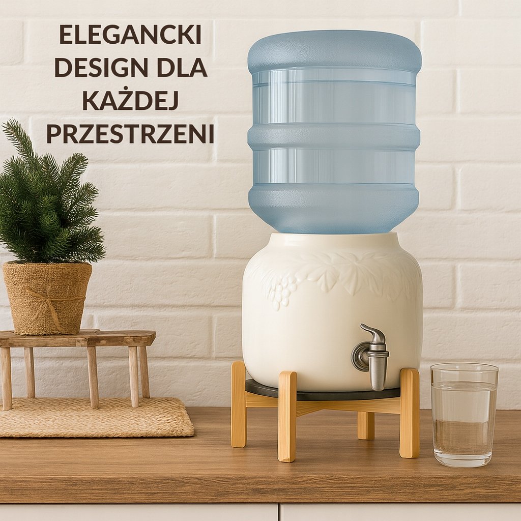 Gładka powierzchnia ceramiki ułatwia utrzymanie higieny, a system nalewania działa bez prądu i filtrów — wystarczy postawić butlę, aby korzystać z wody o każdej porze dnia.