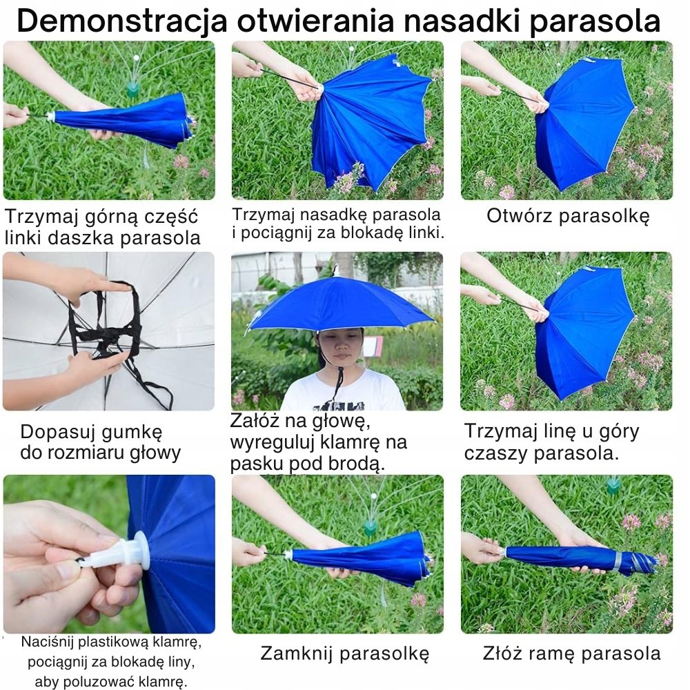 Praktyczna czapka-parasolka to idealne rozwiązanie dla osób, które chcą cieszyć się pełną swobodą ruchów niezależnie od pogody. Dzięki nietypowej konstrukcji parasol mocowany jest bezpośrednio na głowie za pomocą elastycznej opaski, pozostawiając ręce całkowicie wolne. Doskonale sprawdzi się podczas wędkowania, ogrodowych prac, spacerów, biwaków, wycieczek czy aktywności na świeżym powietrzu.