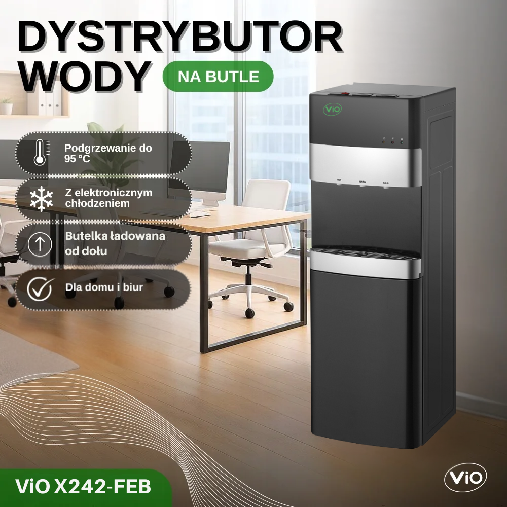 Ten model został stworzony z myślą o osobach, które cenią sobie bezkompromisowy komfort i inteligentne rozwiązania. Ukryta butla sprawia, że obsługa jest dziecinnie prosta, a elektroniczne chłodzenie dba o Twój budżet. Czarny dystrybutor wody ViO X242-FEB to inwestycja w zdrowie, wygodę i estetykę Twojego otoczenia. Zamów już teraz i zapewnij swojej rodzinie lub współpracownikom wygodny dostęp do czystej wody każdego dnia, bez najmniejszego wysiłku fizycznego przy wymianie butli!