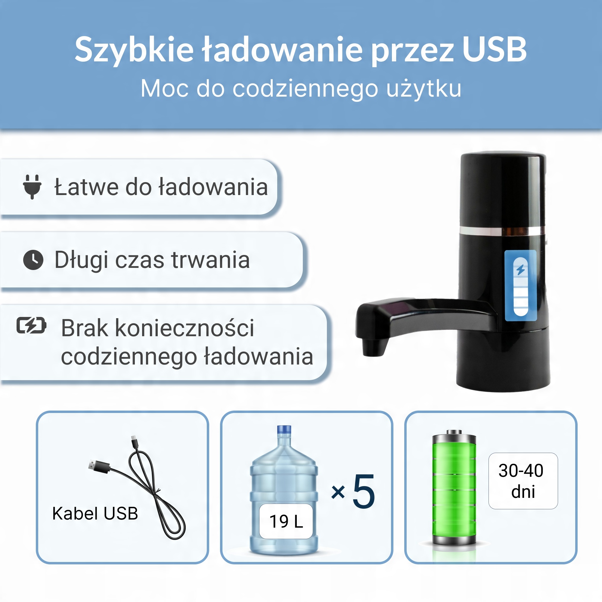 • Bezprzewodowa i mobilna: Ta pompka do wody z wbudowanym akumulatorem zapewnia wygodę użytkowania w dowolnym miejscu. Możesz ją ładować przez USB za pomocą laptopa, powerbanku lub ładowarki samochodowej, co czyni ją idealnym rozwiązaniem dla domu i podróży.