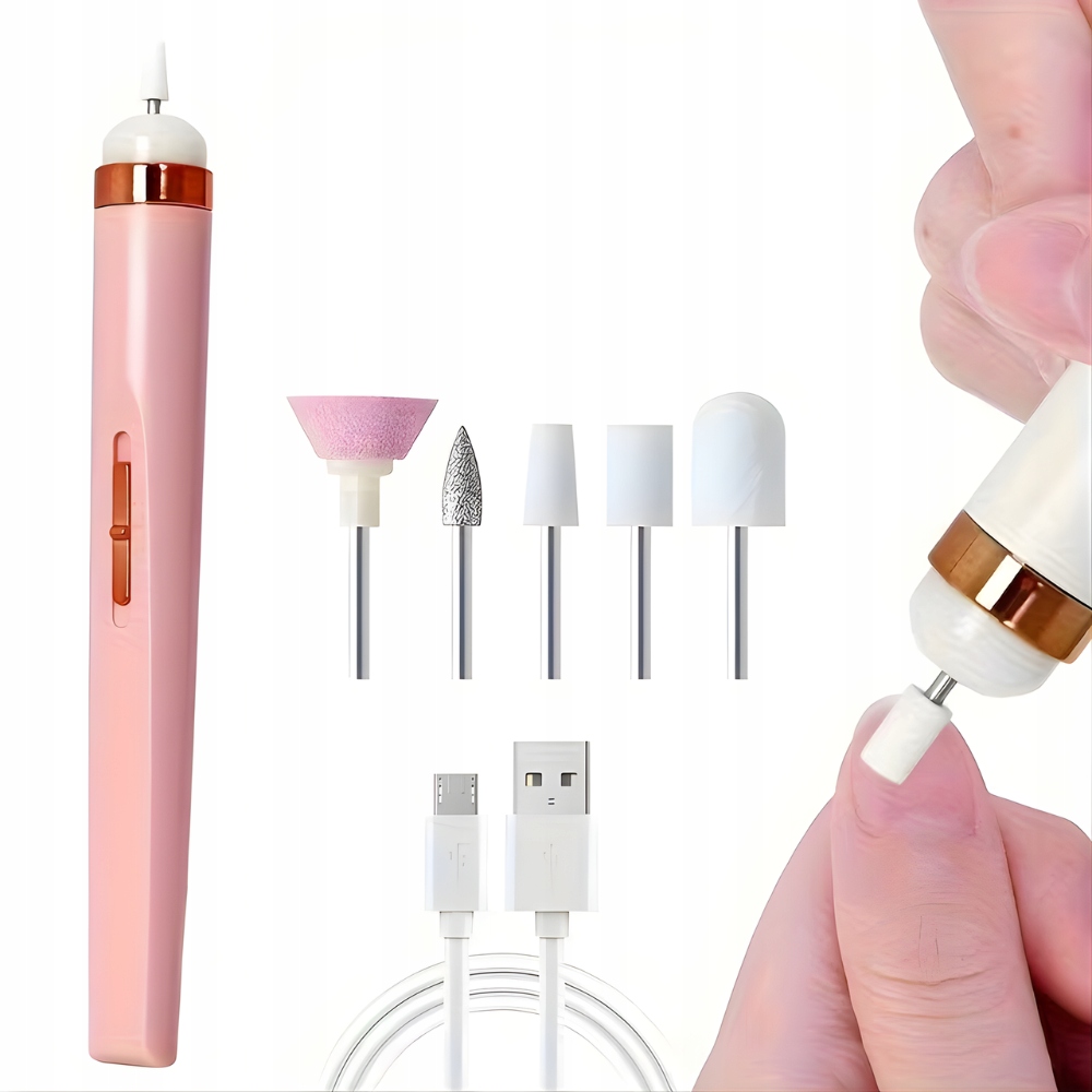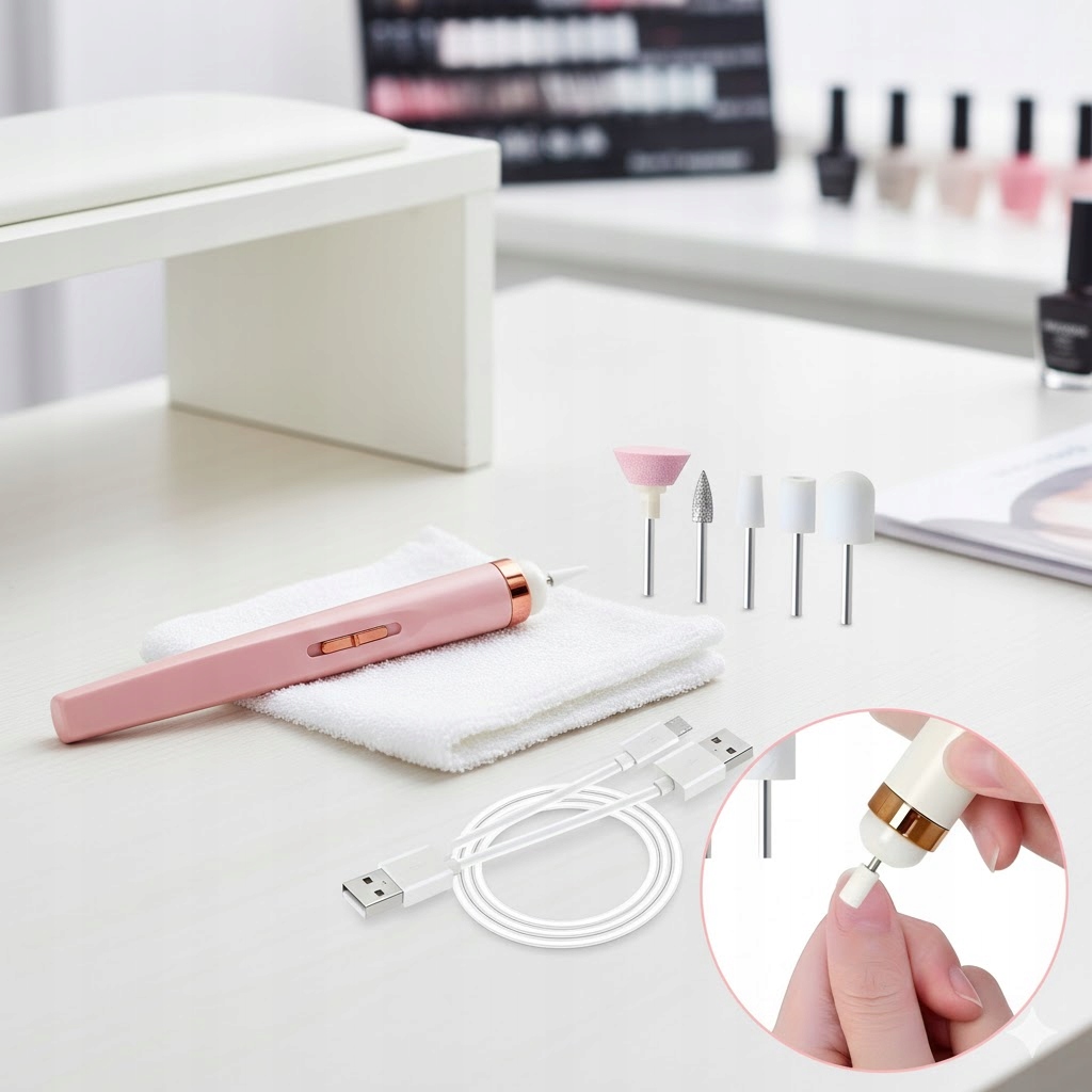 W komplecie z frezarką znajdziesz 5 specjalistycznych bitów, z których każdy został zaprojektowany do innej czynności: od frezów stożkowych do oczyszczania i usuwania żelu, przez cylindryczne do korekty kształtu, po miękkie polerujące do finalnego wykończenia i usuwania skórek. Dzięki wbudowanemu akumulatorowi urządzenie jest w pełni bezprzewodowe i mobilne, a ładowanie przez port USB umożliwia zasilanie z laptopa, powerbanku czy ładowarki samochodowej. Lekka i ergonomiczna obudowa wygodnie leży w dłoni, nie ślizga się, zapewniając precyzję ruchów podczas nawet najbardziej delikatnych zabiegów.
