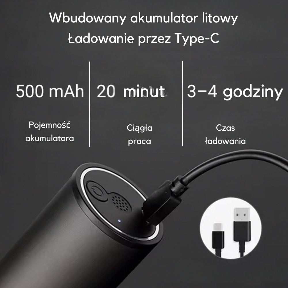 - Wbudowany akumulator 500 mAh – jedno ładowanie (3–4 godziny) zapewnia nawet 20 minut nieprzerwanej pracy.