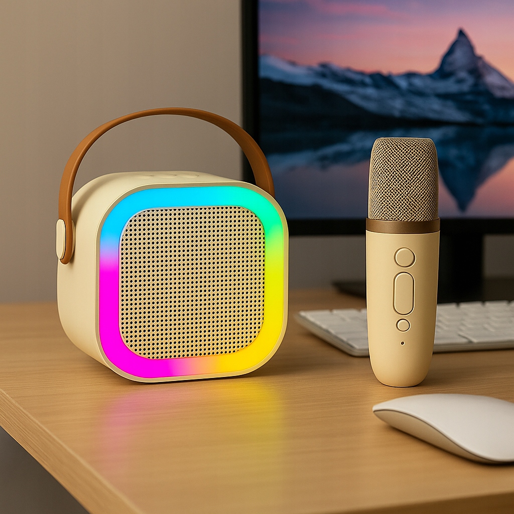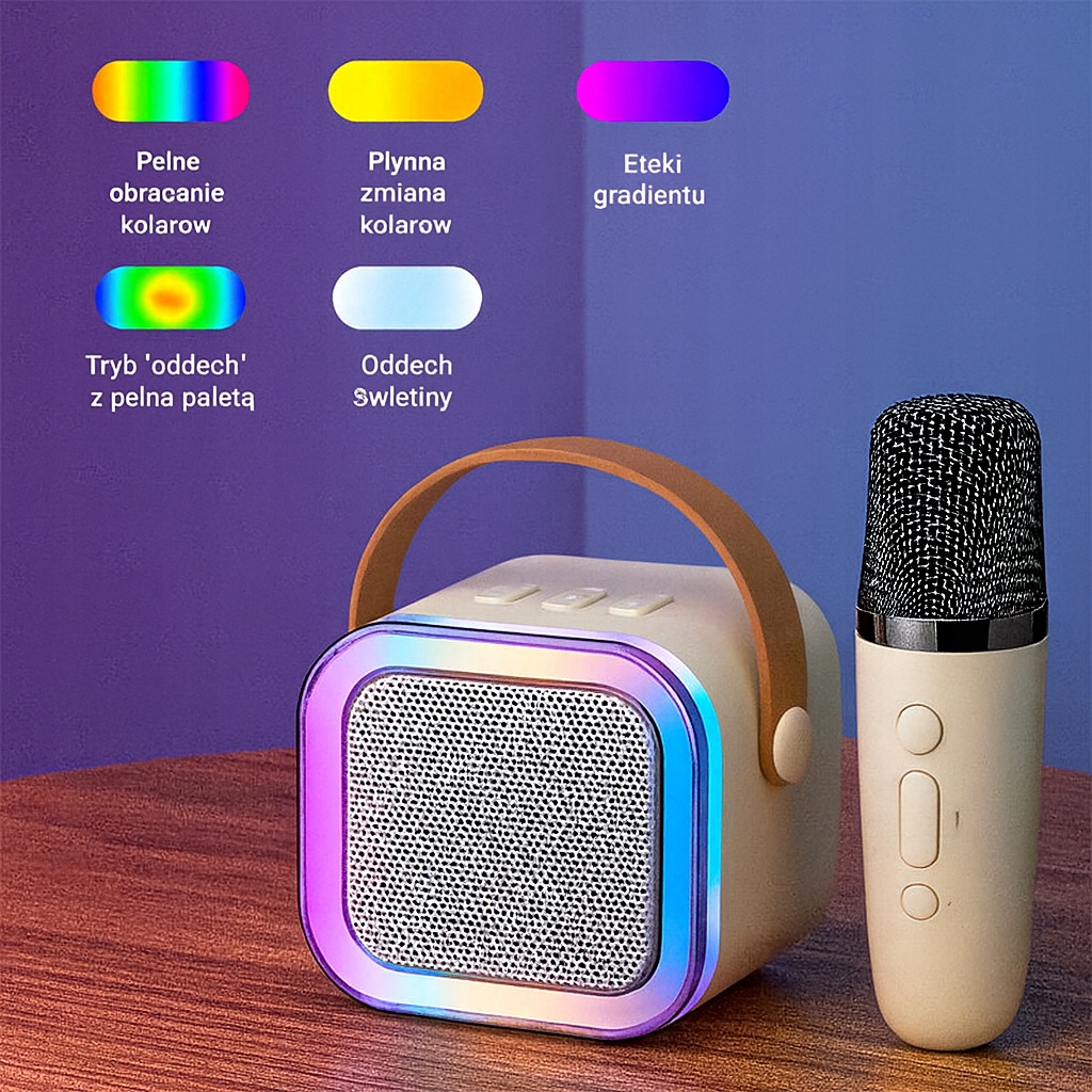 Bezprzewodowy głośnik karaoke z dwoma mikrofonami to doskonały wybór dla miłośników muzyki i śpiewania – zarówno dzieci, jak i dorosłych. Dzięki technologii Bluetooth szybko podłączysz go do smartfona, tabletu czy laptopa, aby cieszyć się ulubionymi utworami. Kolorowe podświetlenie LED dodaje wyjątkowego klimatu każdej imprezie i sprawia, że zabawa staje się jeszcze bardziej niezapomniana.