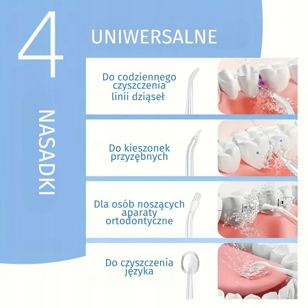 - Profesjonalne Oczyszczanie: Silny strumień wody dociera tam, gdzie nie sięga szczoteczka.