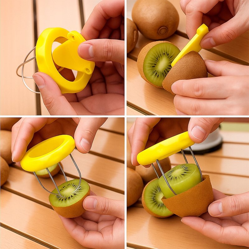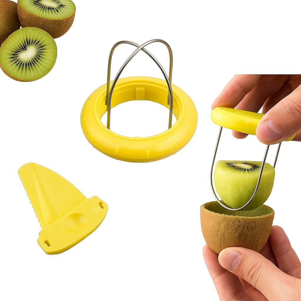 Z jednej strony narzędzia znajduje się nóż z tworzywa sztucznego, który pozwala szybko przekroić kiwi, mango lub inne owoce na pół.