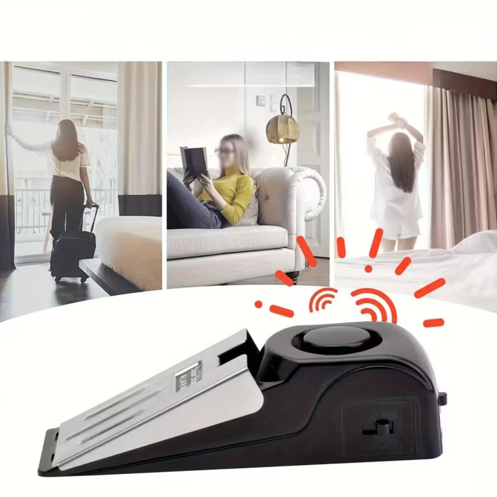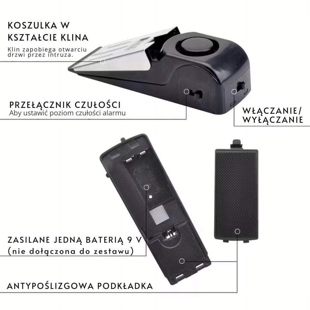 Stoper nie wymaga montażu – wystarczy wsunąć go pod drzwi i włączyć przełącznik ON/OFF. Pasuje do drzwi drewnianych, metalowych, plastikowych i szklanych, a antypoślizgowa gumowa podkładka gwarantuje stabilność nawet na gładkich powierzchniach.