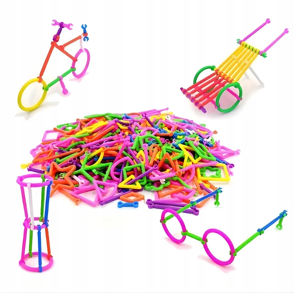 Zestaw zawiera geometrzyczne elementy w różnych formach: kwadraty, trójkąty, gwiazdki, prostokąty i koła, dzięki którym dziecko może budować domki, pojazdy, zwierzątka i własne fantazyjne światy.