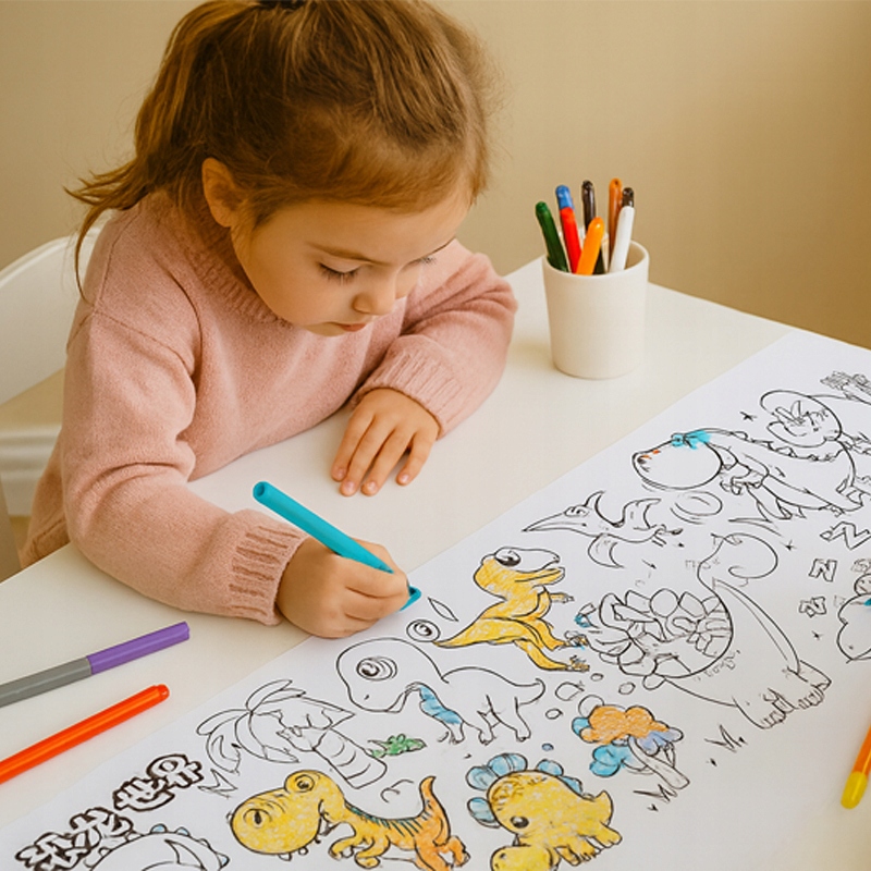 Każda rolka to długi pas papieru wypełniony uroczymi ilustracjami przedstawiającymi dinozaury, wulkany, rośliny i krajobrazy sprzed milionów lat. Dzieci mogą kolorować je kredkami, flamastrami lub farbkami, tworząc swoje własne, barwne prehistoryczne światy.