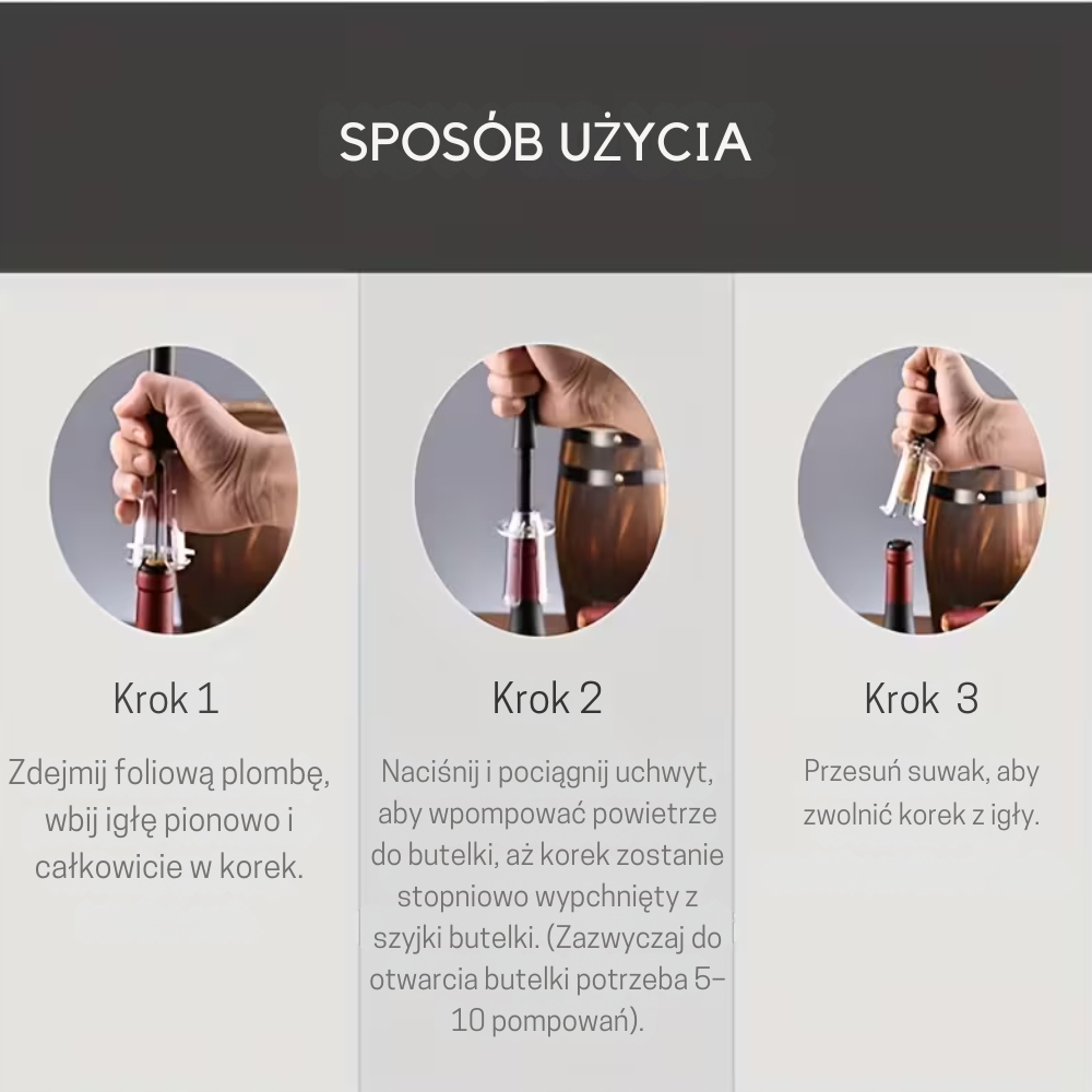 Wystarczy przebić korek szpikulcem, a następnie wpompować powietrze do butelki. Zgromadzone ciśnienie delikatnie wypycha korek do góry – bez siłowania się i bez ryzyka uszkodzenia butelki.