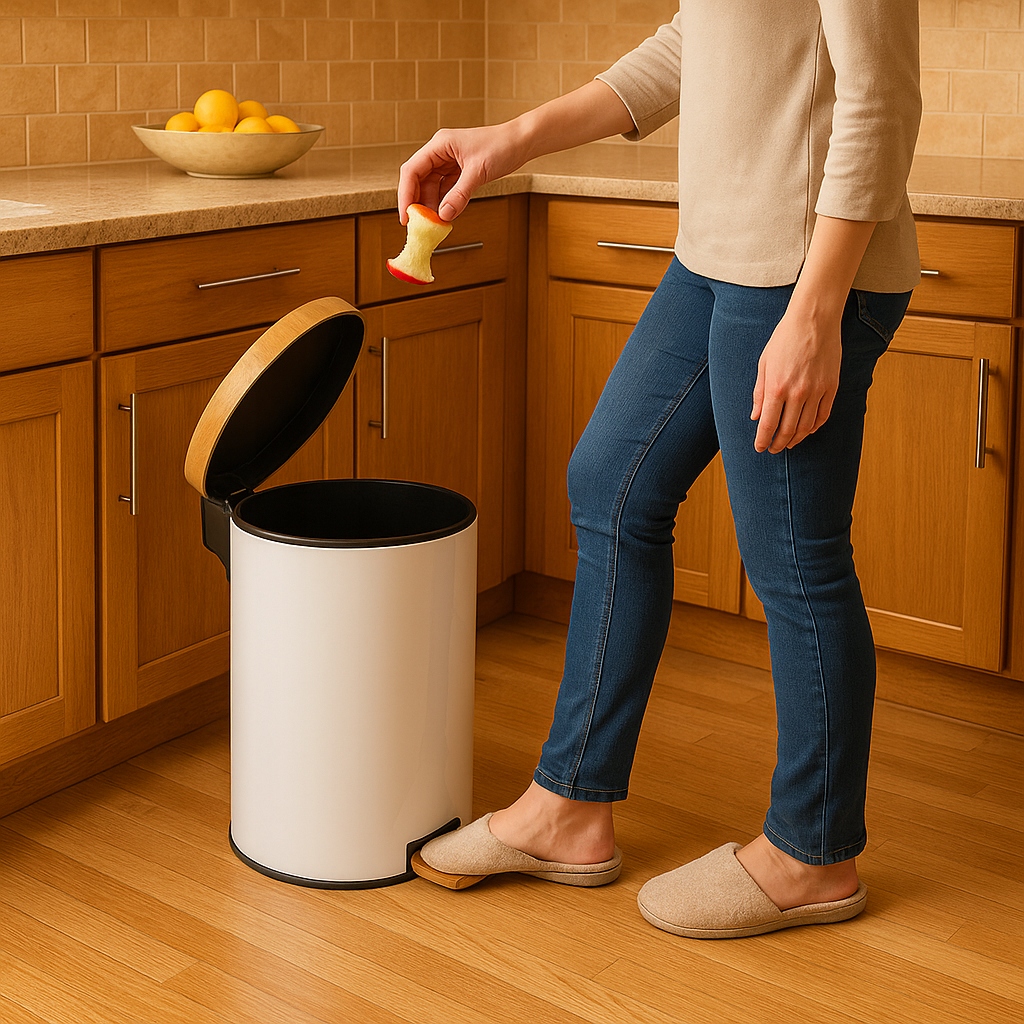- Higieniczne otwieranie – mechanizm pedałowy pozwala korzystać z kosza bez użycia rąk.