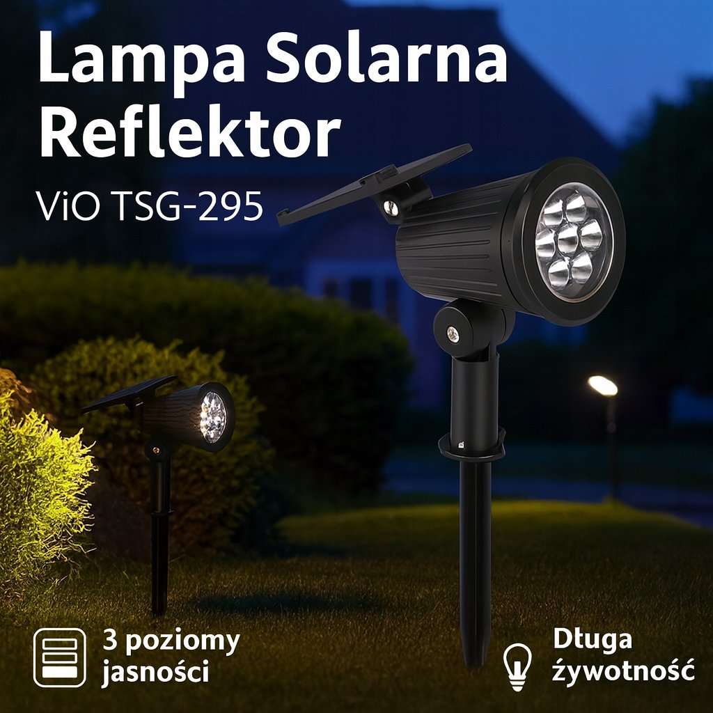 Lampa reflektor solarna ogrodowa TSG-295 to nowoczesne i energooszczędne rozwiązanie do oświetlenia ogrodu, podjazdu, tarasu czy ścieżek. Dzięki zasilaniu energią słoneczną działa całkowicie autonomicznie, włączając się automatycznie o zmierzchu i wyłączając o świcie. Trzy poziomy jasności białego światła pozwalają dostosować intensywność oświetlenia do potrzeb – od delikatnego podświetlenia dekoracyjnego po mocny strumień światła.