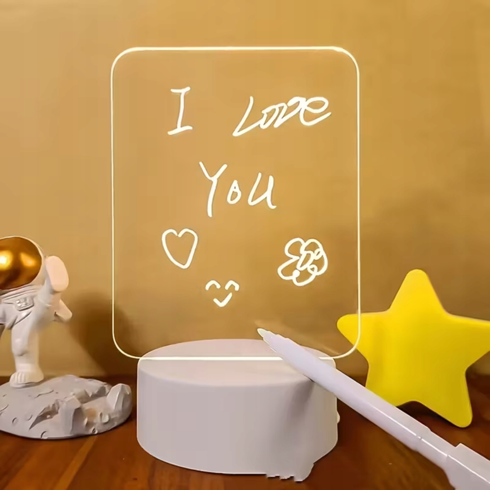 Innowacyjna lampka LED z przezroczystą tablicą do pisania i rysowania to połączenie praktycznego oświetlenia, nowoczesnego designu i kreatywnej funkcjonalności. Przezroczysta akrylowa płytka pozwala tworzyć świecące napisy i ilustracje, które wyglądają jak neonowe efekty. Do zestawu dołączony jest specjalny marker, który łatwo się ściera — dzięki temu tablicę można używać wielokrotnie. Miękkie światło LED tworzy przyjemną atmosferę, idealną do sypialni, biura, pokoju dziecka czy na biurko.