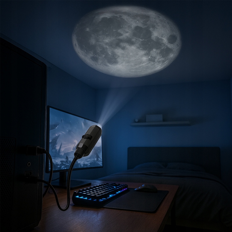 Lampka USB LED ViO TSG-453 to wyjątkowy mini projektor w kształcie Księżyca, który wprowadzi do Twojego wnętrza atmosferę spokoju, relaksu i magii. Dzięki kompaktowej konstrukcji i zasilaniu przez port USB, możesz używać jej dosłownie wszędzie — w sypialni, biurze, samochodzie czy podczas podróży.