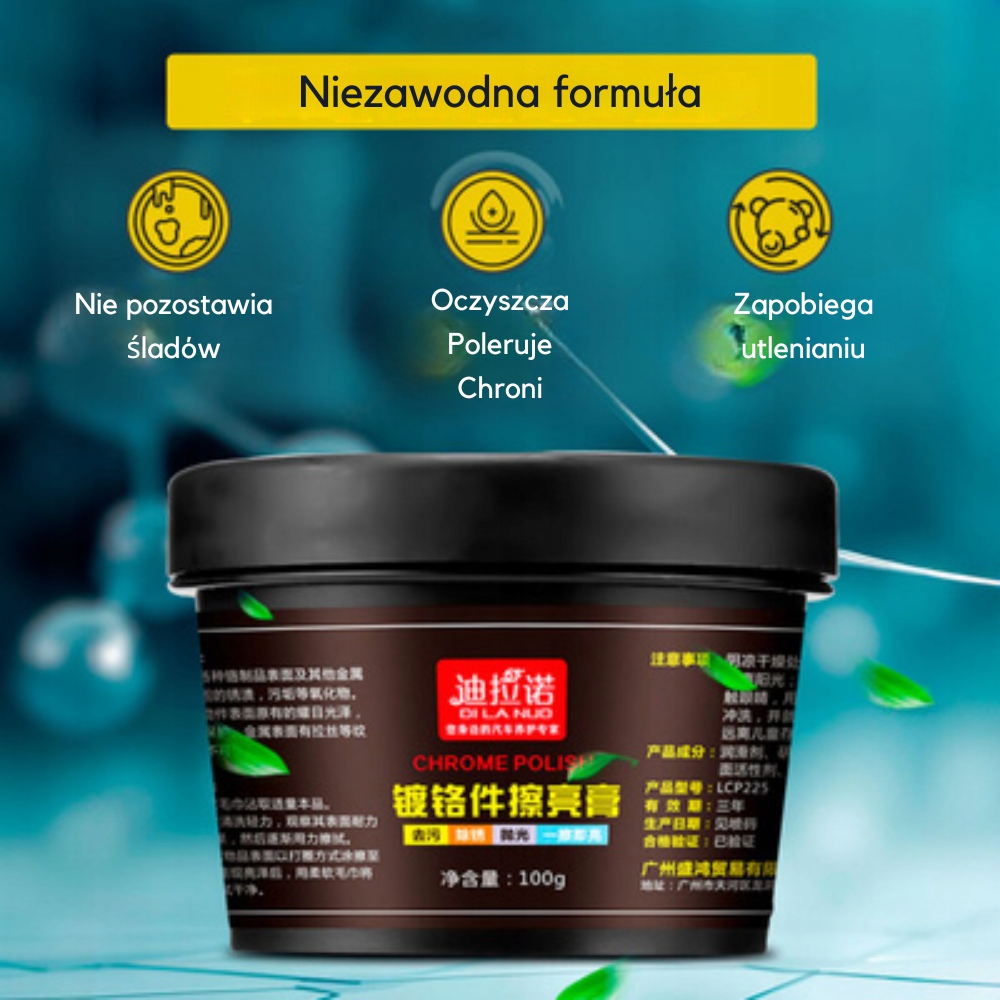 • Przywrócenie Blasku: Efektywnie poleruje i przywraca głęboki, lustrzany połysk zmatowiałym chromom.