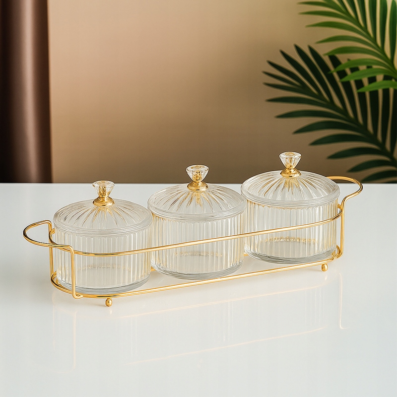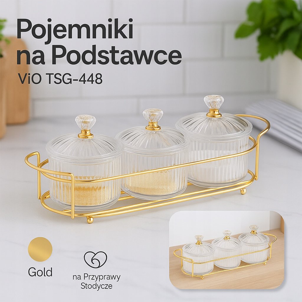 ViO TSG-448 to elegancki zestaw trzech akrylowych pojemników na przyprawy, na przyprawy, słodycze lub drobne produkty spożywcze. Umieszczone na złotej metalowej podstawce, łączą funkcjonalność i estetykę, stanowiąc zarówno praktyczny element wyposażenia kuchni, jak i stylową ozdobę wnętrza.