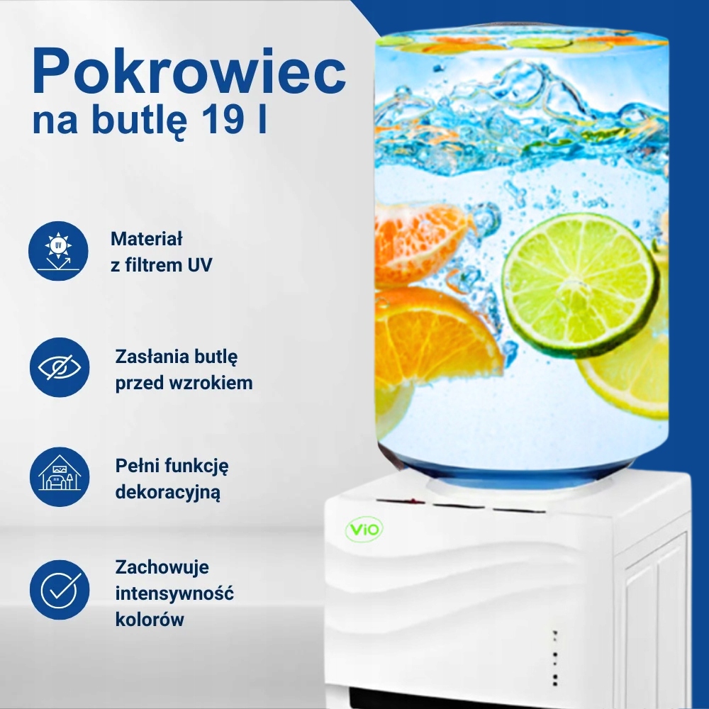 Pokrowiec Dekoracyjny ViO BC04 „Fala Cytrusowa” to praktyczny i stylowy akcesorium, który pozwala na estetyczne ukrycie butli z wodą (18,9 litra) oraz skuteczną ochronę zawartości przed niekorzystnym działaniem światła. Energetyczny, cytrusowy wzór wprowadza świeży i optymistyczny akcent do każdego wnętrza, od kuchni po biuro, a łatwość montażu i konserwacji czyni go niezbędnym dodatkiem do każdego dystrybutora z górnym ładowaniem butli.