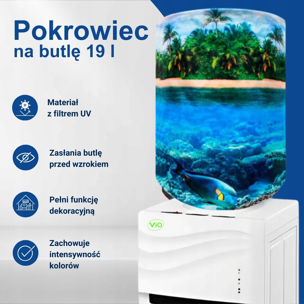 Pokrowiec Dekoracyjny ViO BC11 „Błękitny Brzeg” to wyjątkowy akcesorium, który pozwala nadać konstrukcji dystrybutora wody atrakcyjny i estetyczny wygląd. Zaprojektowany z myślą o biurach, placówkach medycznych, szkołach oraz wnętrzach domowych, pokrowiec skutecznie maskuje plastikową butlę, wprowadzając do pomieszczenia nutę świeżości i wyrafinowanego stylu. Motyw lazurowego wybrzeża sprawia, że kuler przestaje być tylko urządzeniem technicznym, a staje się estetycznym elementem dekoracyjnym.