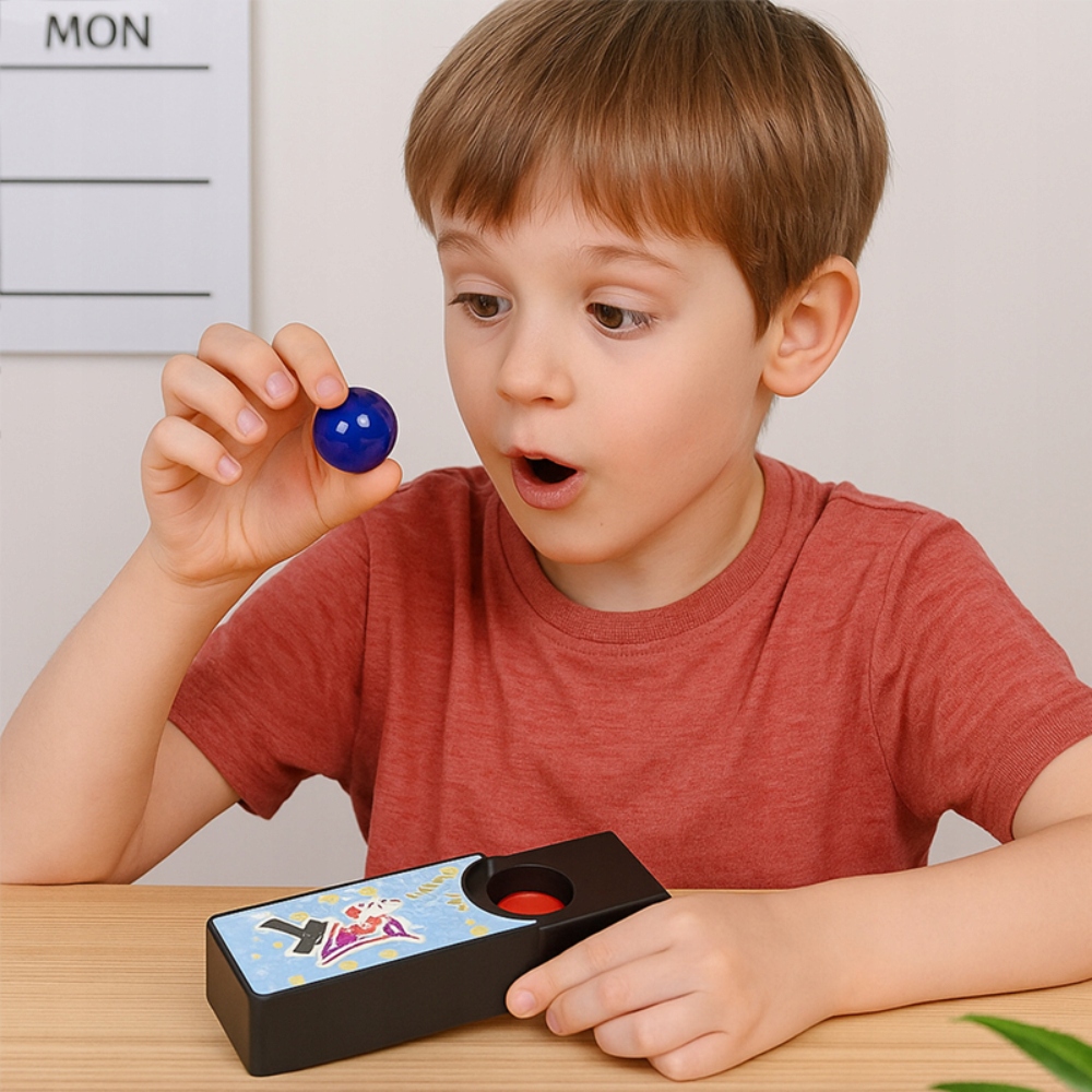 To niezwykle efektowna zabawka edukacyjna, która pobudza kreatywność, uczy cierpliwości i zachęca do samodzielnych występów. Zestaw składa się ze specjalnego pudełka z podwójnym dnem oraz dwóch kolorowych kulek (czerwonej i niebieskiej). Dzięki prostemu mechanizmowi iluzji dziecko może z łatwością opanować sztuczkę i zaskakiwać rodzinę magicznym pokazem.