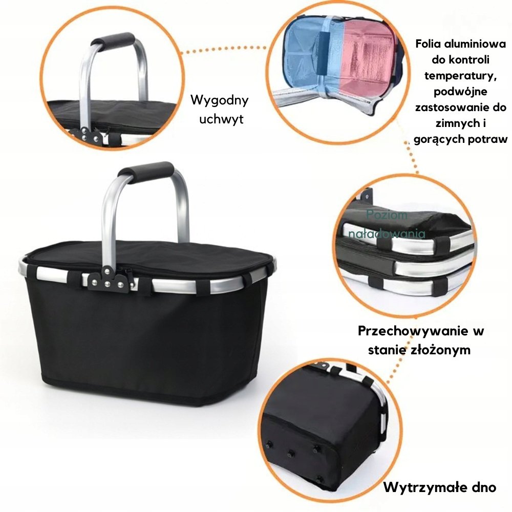 Dzięki wewnętrznej warstwie z folii aluminiowej, koszyk skutecznie utrzymuje temperaturę żywności i napojów. Latem chroni przed przegrzewaniem, a zimą pozwala dłużej cieszyć się ciepłymi posiłkami. Metalowa rączka z miękką nakładką zapewnia komfort nawet przy dużym obciążeniu, a wzmocnione dno gwarantuje stabilność na każdej powierzchni. To idealny wybór nie tylko na pikniki, ale również na zakupy, wycieczki i codzienne zadania.