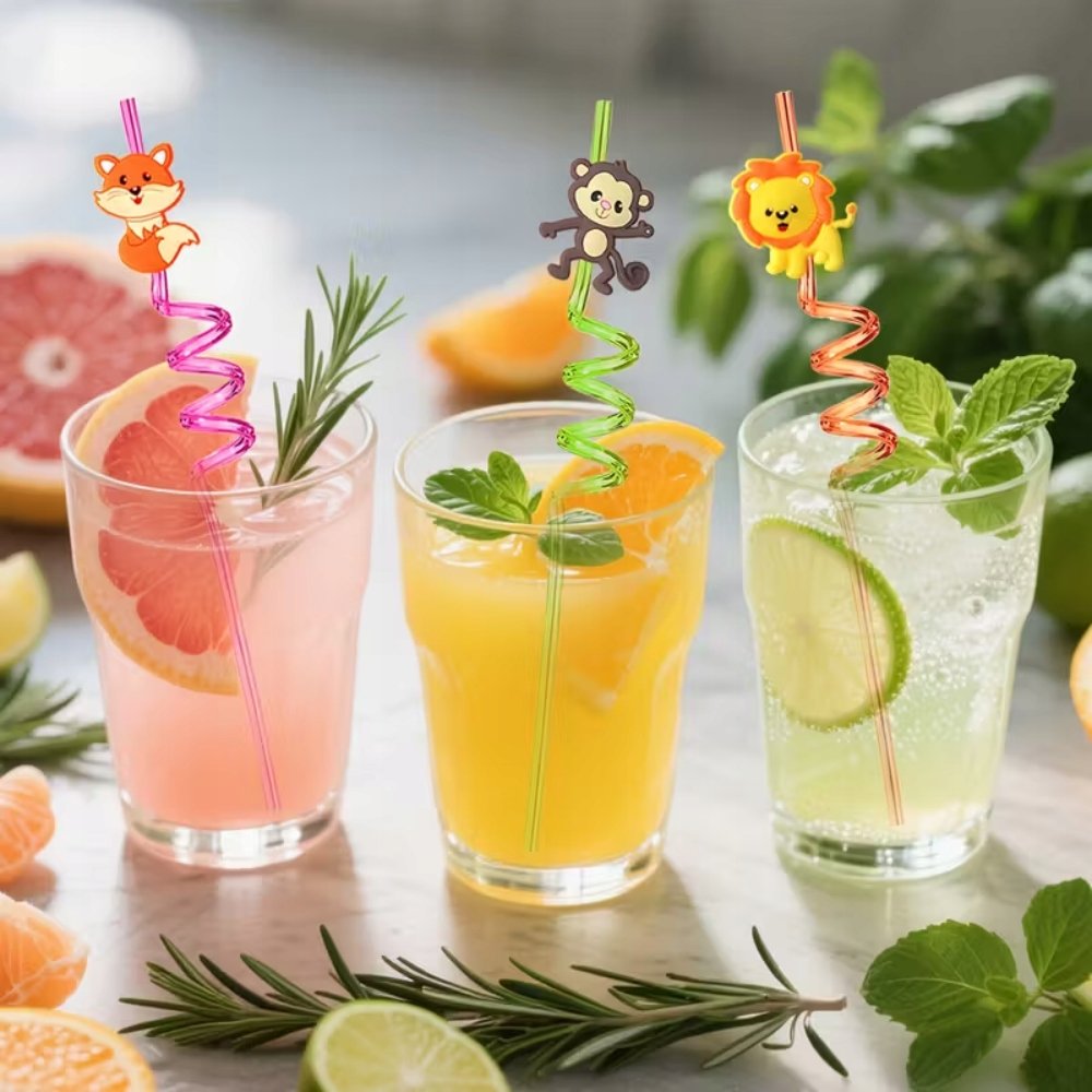 Zestaw 4 kolorowych Słomek Plastikowych TSG-517 to radosny i ekologiczny akcesorium, który zamienia picie napojów w fascynującą zabawę, zachęcając dzieci do spożywania większej ilości wody, soków i koktajli. Dzięki skręcanemu kształtowi i uroczym figurkom zwierząt słomki są wyjątkowo atrakcyjne na przyjęciach urodzinowych, piknikach oraz podczas codziennego użytku w domu. Wykonane z bezpiecznego plastiku spożywczego, są wielokrotnego użytku, łatwe do mycia i neutralne dla smaku napojów.