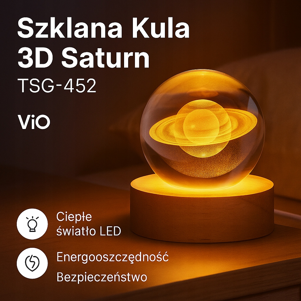 Wysokiej jakości szkło oraz precyzyjne, głębokie grawerowanie 3D sprawiają, że efekt Saturna wygląda jak zawieszony wewnątrz kuli — tworząc niezwykłą iluzję przestrzenności. Ciepłe światło LED dodaje lampce subtelności i relaksującego charakteru, idealnego do wieczornego odpoczynku. Zasilanie przez USB umożliwia podłączenie jej do laptopa, powerbanku czy adaptera, dzięki czemu lampka jest wygodna i energooszczędna w codziennym użytkowaniu. Drewniana podstawa podkreśla jej naturalny, minimalistyczny styl.