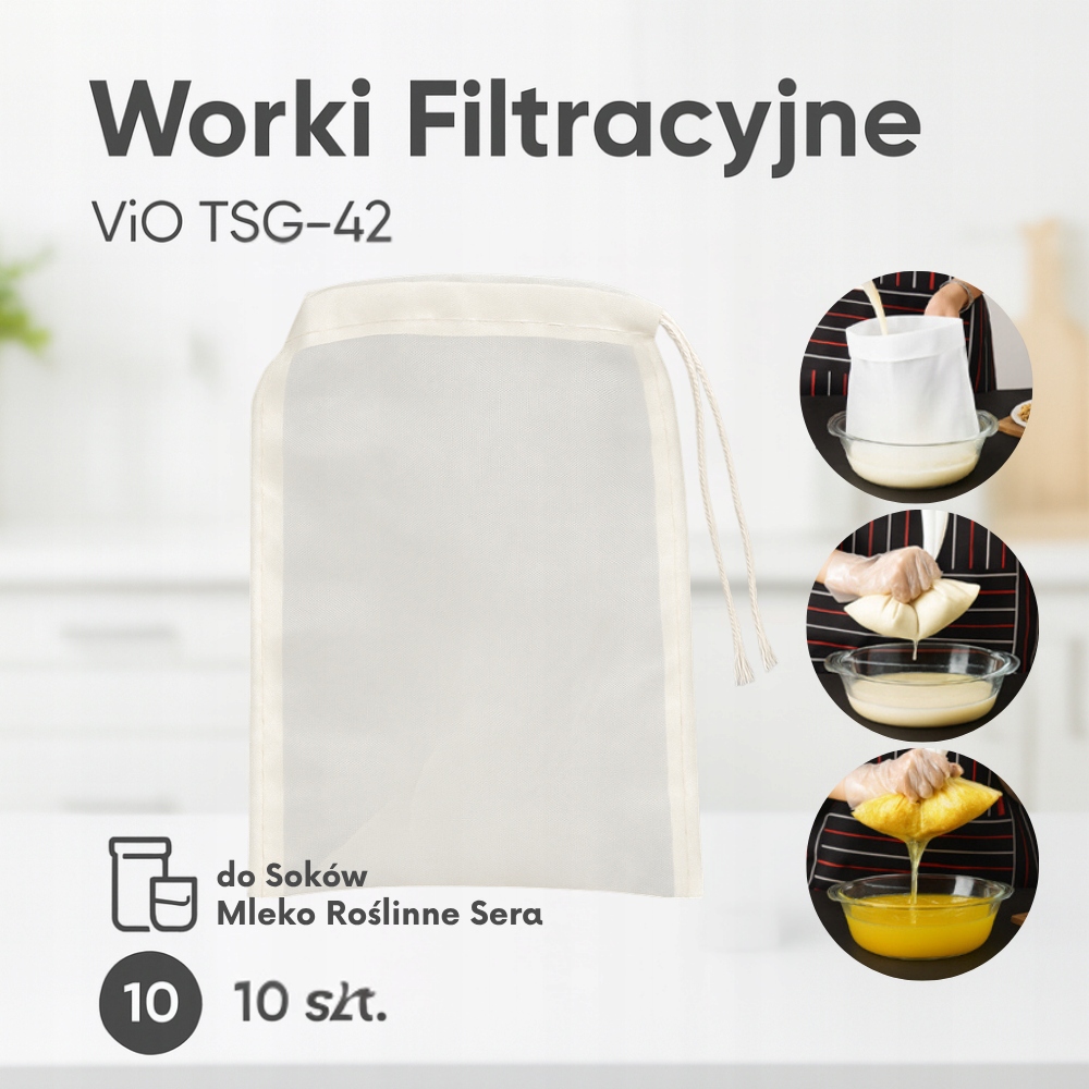 Worek filtracyjny ViO TSG-42 to niezastąpione narzędzie w kuchni każdego, kto ceni zdrowe, naturalne i domowe produkty. Pozwala przygotować świeże napoje bez konserwantów i chemii, a przy tym jest łatwy w czyszczeniu i wielokrotnego użytku.