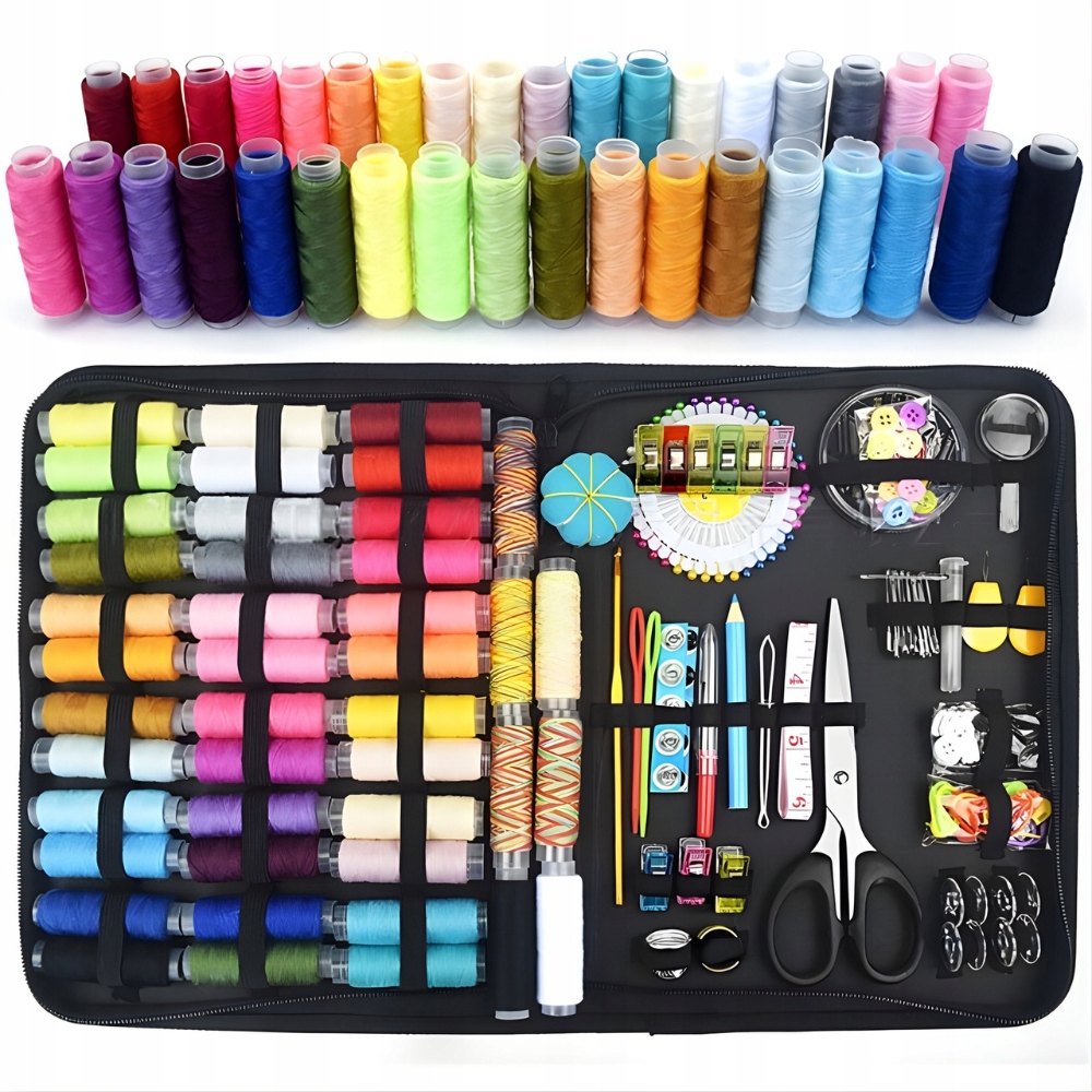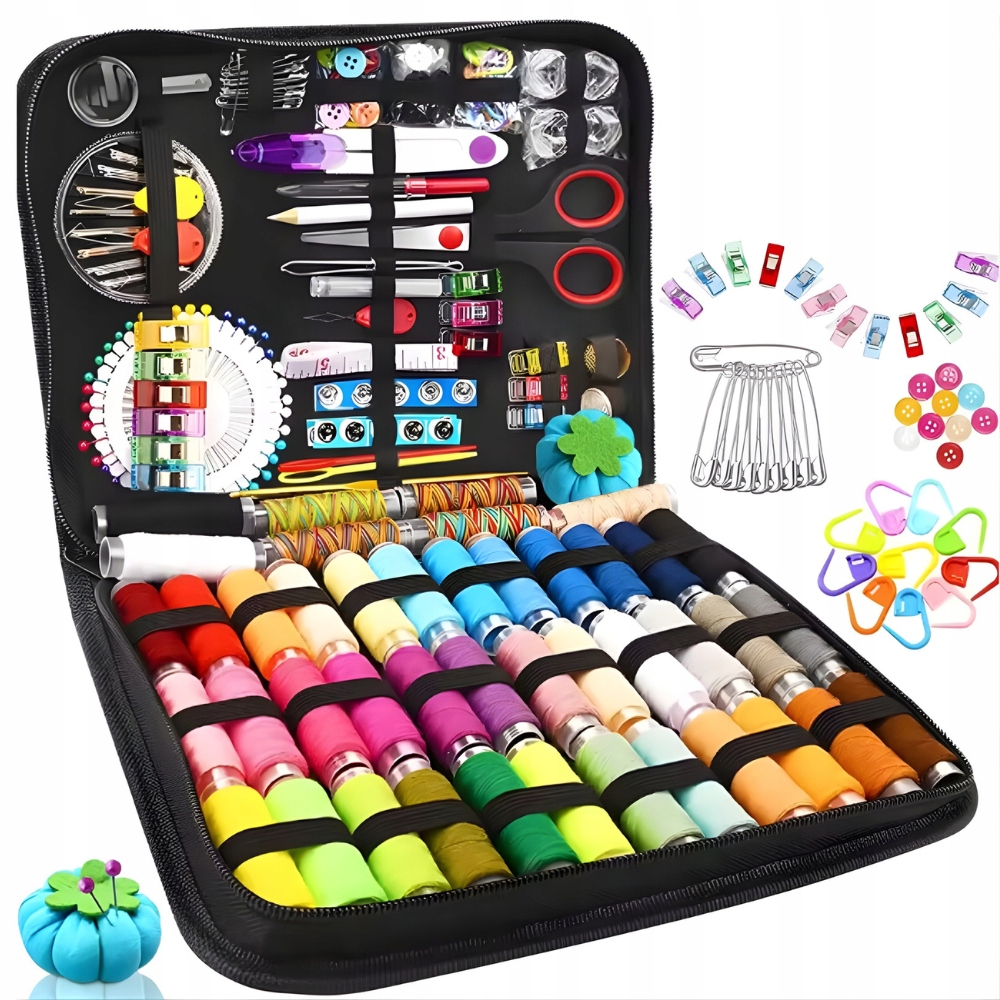 • 226 elementów w jednym zestawie – nici, igły, szpilki, guziki, naparstki, nożyczki, pęseta i wiele innych.