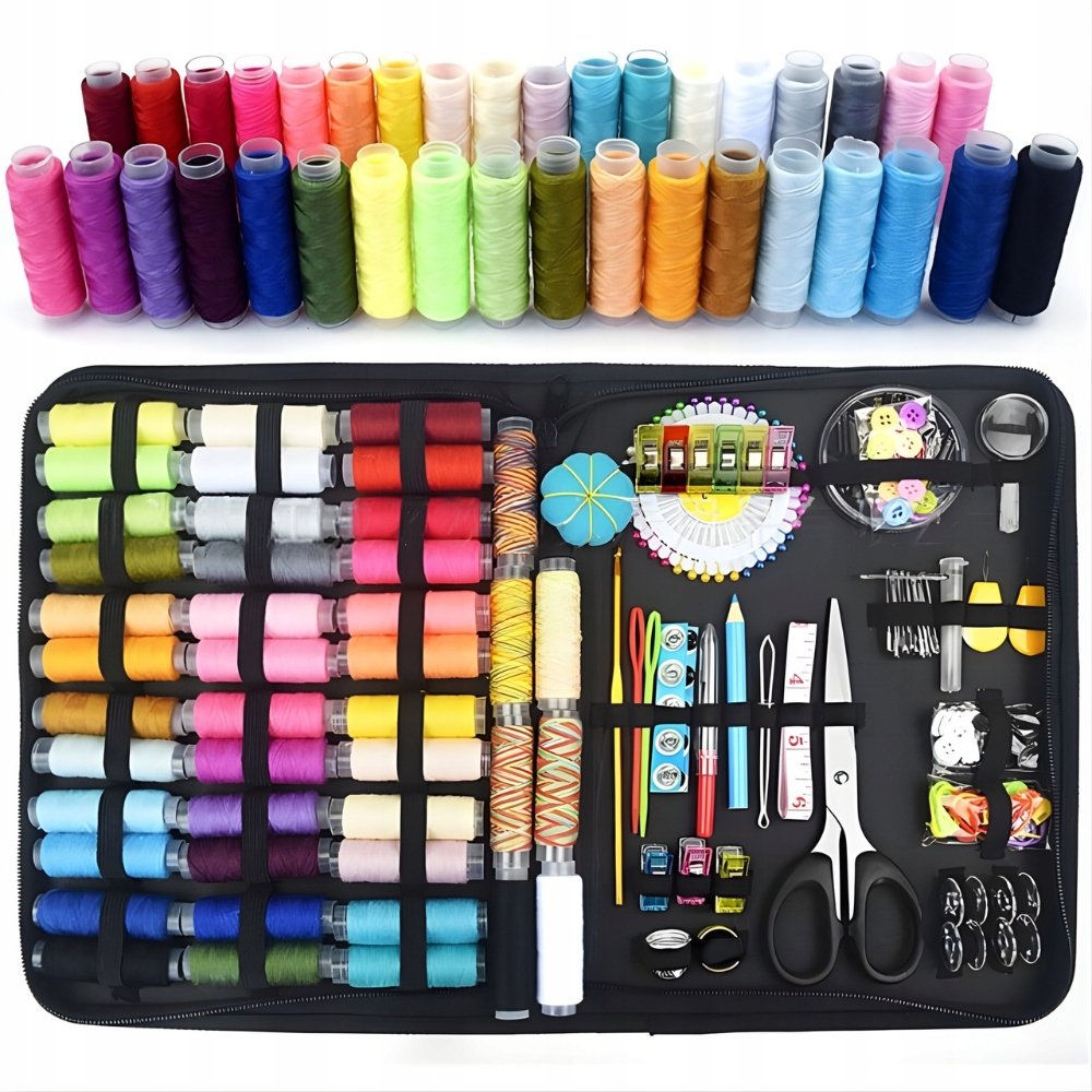 Ten profesjonalny przybornik krawiecki zawiera wszystko, czego potrzebujesz do szycia, cerowania, tworzenia i naprawy ubrań. W środku znajdziesz nici w 43 kolorach, igły, szpilki, naparstki, guziki, nożyczki, miarkę, pęsetę i wiele innych akcesoriów. Każdy element ma swoje miejsce w elastycznym uchwycie, co zapobiega chaosowi i pozwala na szybki dostęp do potrzebnych narzędzi. Kompaktowe wymiary 26 × 19,5 cm sprawiają, że zestaw bez problemu zmieści się w torbie, walizce lub szufladzie.