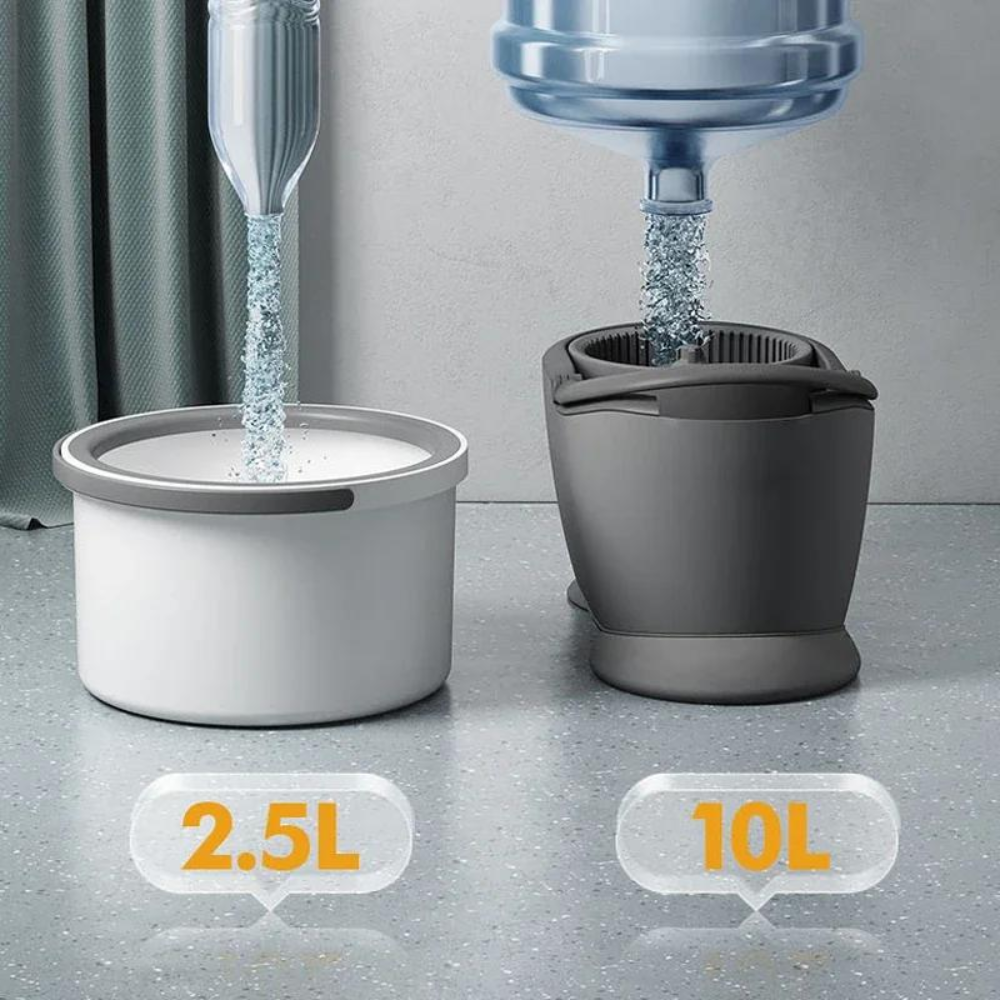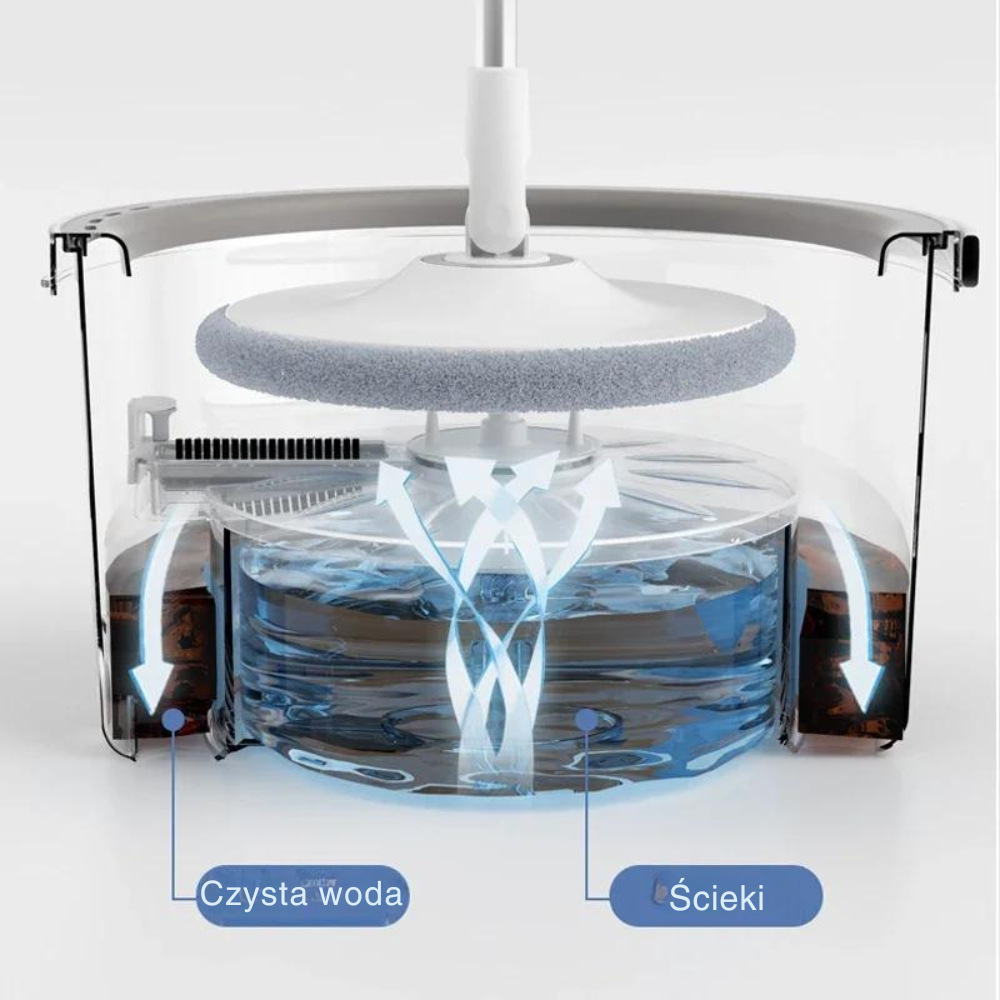Kluczowym atutem tego zestawu jest inteligentny system separacji wody. Wiadro zostało skonstruowane w taki sposób, aby oddzielać wodę czystą od brudnej. Dzięki temu masz pewność, że płuczesz nakładkę zawsze w świeżej wodzie, a brud i zanieczyszczenia są skutecznie izolowane w oddzielnym zbiorniku. Mechanizm czyszczący automatycznie usuwa kurz, włosy i drobinki z mikrofibry, jednocześnie odciskając nadmiar wilgoci. To gwarancja najwyższej higieny – Twoje ręce pozostają czyste i suche przez cały proces sprzątania.