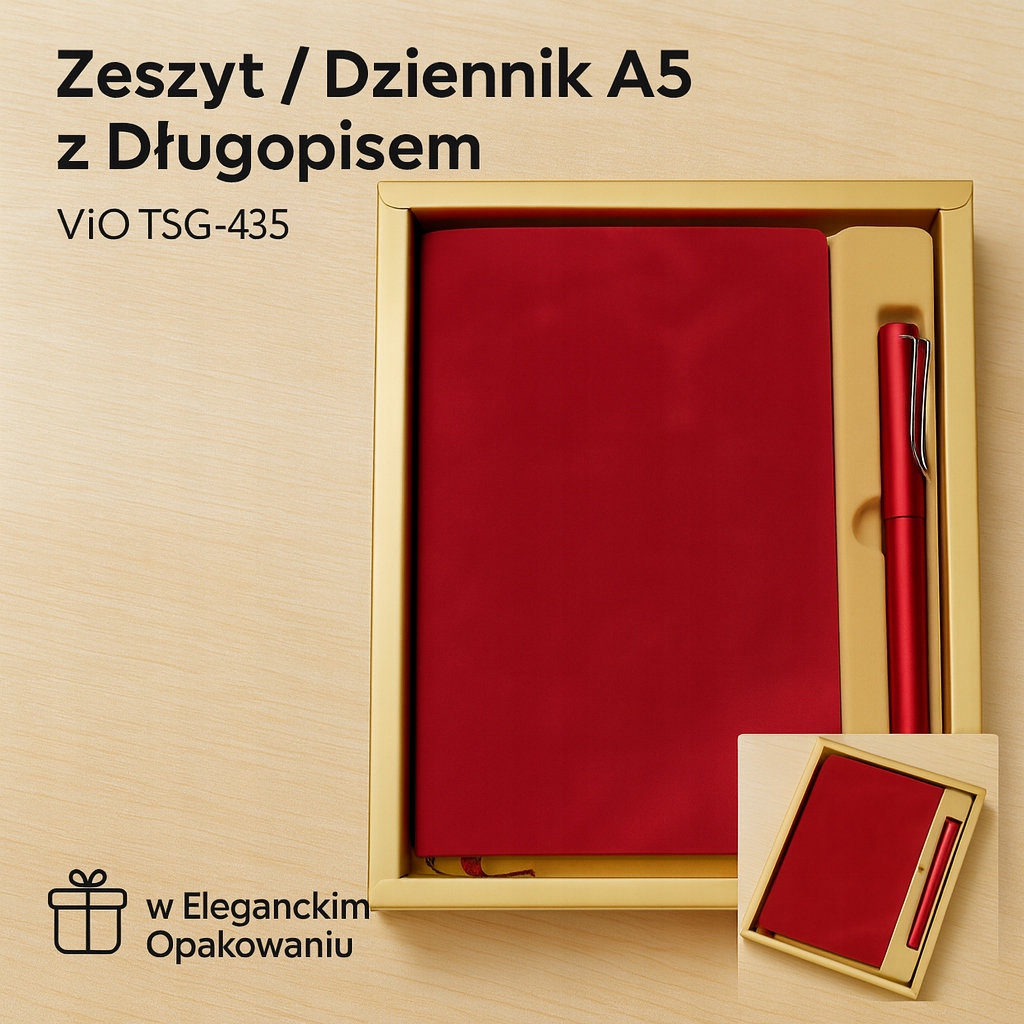 Zestaw TSG-435 to stylowy i praktyczny komplet, który łączy funkcjonalność z elegancją. Składa się z dziennika formatu A5 w miękkiej oprawie oraz dopasowanego długopisu – całość zapakowana jest w estetyczne pudełko prezentowe. To doskonały pomysł na upominek dla osób, które cenią porządek, styl i jakość w codziennym życiu.